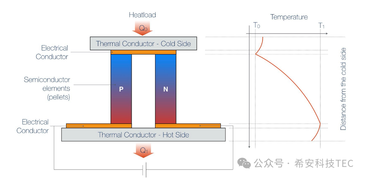 Konduktor termal ditambahake ing ujung termokopel kaya sing ditampilake ing gambar ing ngisor iki: TEC lengkap dibentuk. Nalika TEC wis powered, lumahing ndhuwur bakal nresep panas, kang disebut pungkasan kadhemen, lan panas digunakke Q0. Lumahing ngisor ngeculake panas lan diarani permukaan panas, kanthi panas sing dibebasake yaiku Q1 ; Q1= Q0+Qtec
